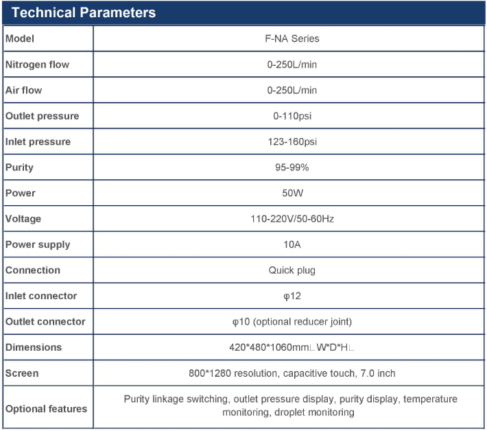All key components in the instrument are made of original products manufactured by world renownedmanufacturers, and the efficient and stable air and nitrogen separation membrane, 0.01 micron filtrationand high-throughput activated carbon adsorption system are selected.